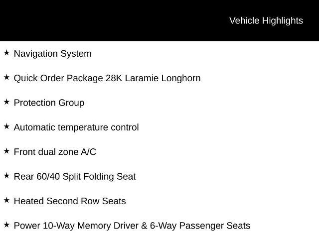 Local Trade. 4-Wheel Disc Brakes, 6000# Front Axle w/Hub Ext, Auto Level Rear Air Suspension, Automatic temperature control, Box & Rear Fender Clearance Lamps, Brake assist, Bucket Seats, Chrome Tubular Side Steps, Clearance Lamps, Delay-off headlights, Dual front impact airbags, Dual front side impact airbags, Dual Rear Wheel Fender Flare Tracking, Dual Rear Wheels, Electronic Stability Control, Front anti-roll bar, Front Bucket Seats, Front dual zone A/C, Front fog lights, Fully automatic headlights, Garage door transmitter, Genuine wood console insert, Genuine wood dashboard insert, Genuine wood door panel insert, Heated door mirrors, Heated Front Seats, Heated front seats, Heated rear seats, Heated Second Row Seats, High Back Seats, Leather steering wheel, Low tire pressure warning, Memory seat, Navigation System, Occupant sensing airbag, Outside temperature display, Overhead airbag, ParkView Rear Back-Up Camera, Pedal memory, Power 10-Way Memory Driver & 6-Way Passenger Seats, Power driver seat, Power passenger seat, Power steering, Power Sunroof, Power windows, Protection Group, Quick Order Package 28K Laramie Longhorn, Rear 60/40 Split Folding Seat, Rear reading lights, Rear seat center armrest, Remote keyless entry, Split folding rear seat, Steering wheel mounted audio controls, Tilt steering wheel, Tip Start, Tire Pressure Monitoring Delete, Turn signal indicator mirrors, Ventilated Front Seats, Ventilated front seats, Wheels: 17" x 6.0" Premium Aluminum.