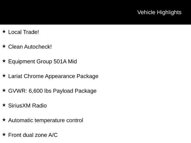 This is a Jerry’s Certified vehicle which offers true peace of mind. Each one includes a 30-day / 1,000-mile limited warranty, a comprehensive 115-point inspection, a free AutoCheck history report, and professional detailing and reconditioning. These vehicles are inspected, protected, and guaranteed, making them a standout choice for buyers seeking reliability and value. Local Trade!, Clean Autocheck!, 4WD, 110V/400W Outlet, 4-Wheel Disc Brakes, ABS brakes, Adjustable pedals, AppLink/Apple CarPlay and Android Auto, Auto High-beam Headlights, Auto-dimming door mirrors, Auto-dimming Rear-View mirror, Automatic temperature control, BLIS Blind Spot Information System, Bumpers: chrome, Chrome 2-Bar Grille w/4 Minor Bars, Chrome Angular Step Bars, Chrome Door & Tailgate Handles w/Body-Color Bezel, Chrome Skull Caps on Exterior Mirrors, Class IV Trailer Hitch Receiver, Compass, Delay-off headlights, Driver vanity mirror, Dual front impact airbags, Dual front side impact airbags, Engine Block Heater, Equipment Group 501A Mid, Exterior Parking Camera Rear, Front anti-roll bar, Front dual zone A/C, Front fog lights, Front reading lights, Front wheel independent suspension, Fully automatic headlights, GVWR: 6,600 lbs Payload Package, Heated door mirrors, Heated front seats, Illuminated entry, Lariat Chrome Appearance Package, Leather-Trimmed 40/20/40 Front Seat, LED Sideview Mirror Spotlights, Low tire pressure warning, Occupant sensing airbag, Overhead airbag, Pedal memory, Power driver seat, Power Glass Sideview Mirr w/Body-Color Skull Caps, Power passenger seat, Power steering, Power windows, Rear window defroster, Remote keyless entry, Remote Start System w/Remote Tailgate Release, Reverse Sensing System, Single-Tip Chrome Exhaust, SiriusXM Radio, Split folding rear seat, Steering wheel mounted audio controls, Tilt steering wheel, Turn signal indicator mirrors, Universal Garage Door Opener, Ventilated front seats, Wheels: 18" Chrome-Like PVD. Odometer is 58309 miles below market average!