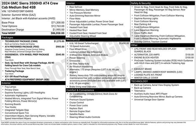 Local Trade!, Sierra 3500HD AT4, 4D Crew Cab, Duramax 6.6L V8 Turbodiesel, 10-Speed Automatic, 4WD, Summit White, Jet Black With Kalahari Accents Leather, 10-Way Power Driver Seat Adjuster w/Lumbar, 10-Way Power Passenger Seat Adjuster w/Lumbar, 120-Volt Bed Mounted Power Outlet, 120-Volt Instrument Panel Power Outlet, 2 Charge-Only Rear USB Ports, 2 Charge/Data USB Ports Inside Center Console, 2 USB Ports, 2-Speed Active Transfer Case, AT4 Preferred Package, Auto-Dimming Inside Rearview Mirror w/Camera, Automatic temperature control, Bed View Camera w/2 Trailer Camera Provisions, Bose Premium 7-Speaker Sound System, Driver Memory, Floor-Mounted Center Console, Front Bucket Seats, Front Rain-Sensing Wipers, Gloss Black Header & Grille Insert Bars, Gooseneck/5th Wheel Prep Package, HD Surround Vision, Heated 2nd Row Outboard Seats, Integrated Trailer Brake Controller, LED Cargo Area Lighting, LED Smoked Amber Roof Marker Lamps, Multicolor 15 Diagonal Head-Up Display, Power Sliding Rear Window w/Defogger, Preferred Equipment Group 4SB, Rear Cross Traffic Alert, Rear Wheelhouse Liners, Safety Alert Seat, SiriusXM w/360L, Spray-On Pickup Bedliner w/AT4 Logo, Technology Package, Trailer Camera Provisions, Trailer Side Blind Zone Alert, Wireless Charging, Wireless Phone Projection, X31 Off-Road Package.